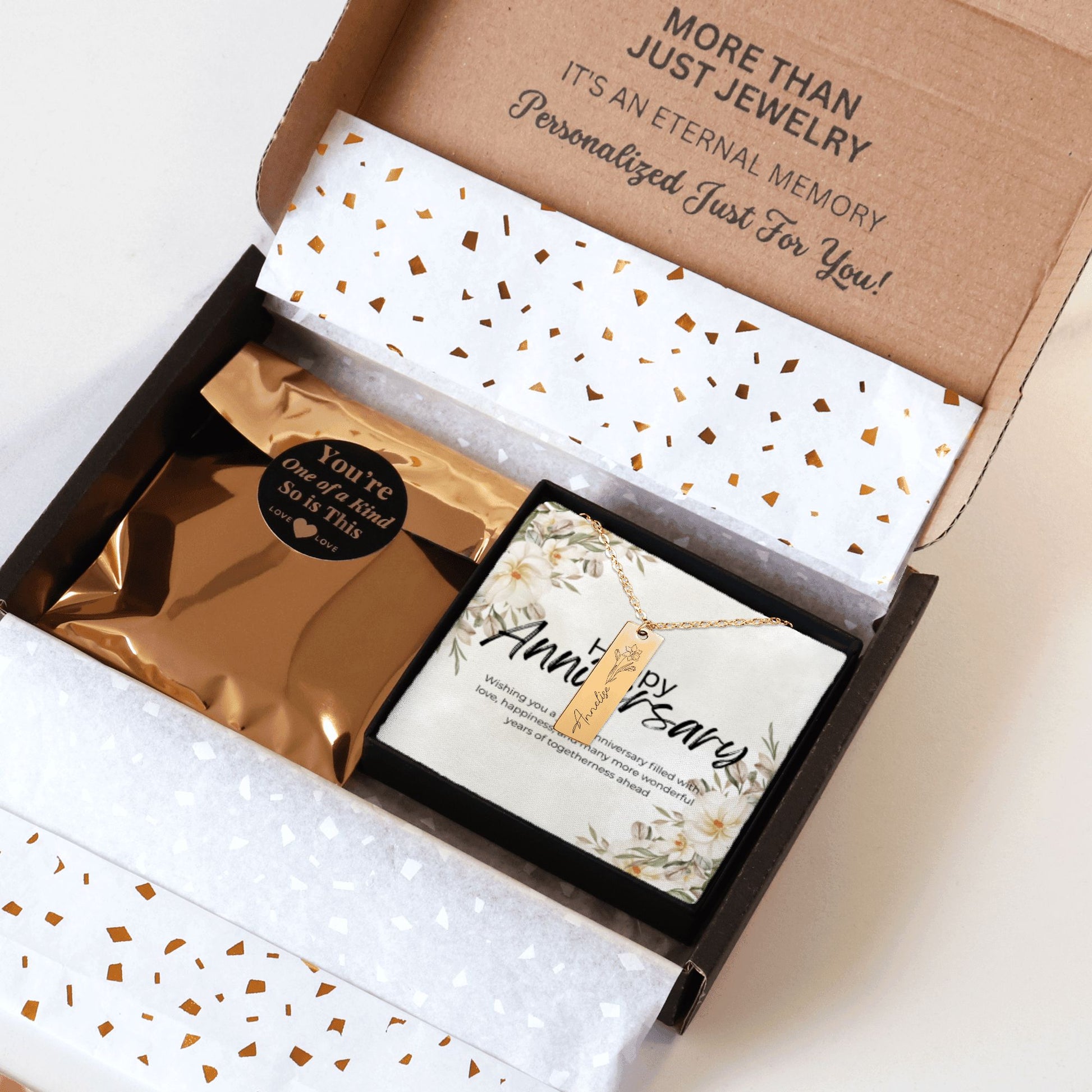 A beautifully engraved necklace, which you helped create!. The necklace will be packed in a gift box.